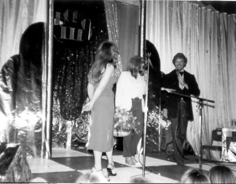 In this black and white photograph three people stand on a stage, the floor of which is large black and white squares. Two young ladies stand at the left. They are nicely dressed, one in a cocktail dress, the other in a long sleeve blouse and ankle length skirt and are holding a basket of flowers between them. There is a microphone on a stand in front of them. They are looking at John Grissim on the right who wears a jacket and tie. He is looking toward them and smiling.Collection