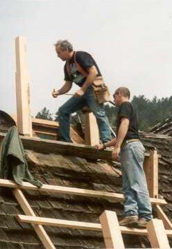 This color print is a close up of Brian Lanigan at the top of the scaffolding on the chapel roof. He is holding a tape measure. There is a man standing below him looking on.Collection