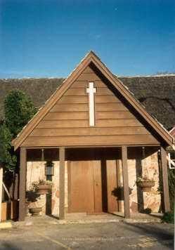 In this color print we see the chapel before construction of the bell tower. It shows a double door entry with a peaked roof overhanging the entry and supported by four posts. There are potted plants hanging under the overhang on each side of the door and a white cross centered under the roof peak on the brown boards. The walls of the chapel are tan stucco and stone.Collection