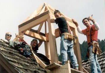 In this color photograph the framework of the bell tower is in place on the chapel roof, being held by two men in front, on the scaffolding, and two men in back, behind the peak of the roof. (See #s 2001-139, 140 and 141-01) The man on the far left is making the Hawaiian 'shaka' sign meaning "all right!" or "cool" and the one on the far right is giving the thumbs up sign. The men are, left to right, Greg Marcott, Brian Lanigan (peering through the framework),Collection