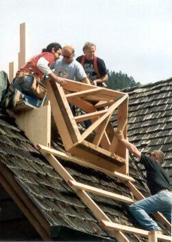 In this color photograph the bell tower roof is almost in place, being pulled up by three of the men on the chapel roof above and pushed by one man on the scaffolding below. (see #s 2001-139-01 and 140-01) The men are left to right above ?, Greg Marcott and Brian Lanigan. The man below isCollection