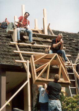 In this color photograph the bell tower roof framework is part way up to the chapel roof. (See previous, #2001-139-01). It is being lifted by the two men below while being pulled by ropes by the two men on the scaffolding above. The men are: left to right on the roof, ? and Brian Lanigan and left to right on the ground Greg Marcott (partially obscured) and ?Collection