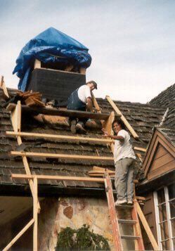 In this color photograph a man sits on the scaffolding up by the bell tower. He is putting tar paper on the siding of the tower, the upper portion of which is covered with blue plastic sheeting. A man stands lower down on a ladder. He is Tyrone Kapahuli.Collection
