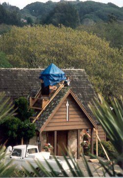 This color photograph was taken from the hillside in front of the chapel, looking across at and on a level with the new bell tower which is wrapped in blue plastic. Trees and hills rise behind the chapel.Collection
