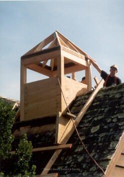 This color photograph shows the bell tower in place, straddling the roof. The sides are on the framework but not the roofing. A man looks over from the other side of the roof with his hand on the tower.Collection