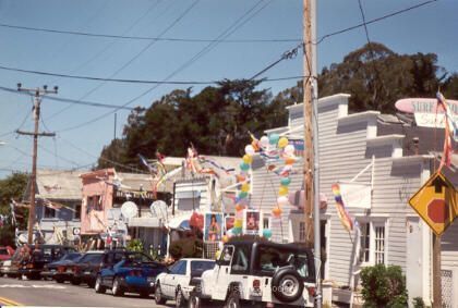This color photograph is of a row of buildings along the street (Highway One). The buildings are festooned with banners and balloons. There is a row of parked cars in front of the buildings. The buildings housed, starting at the right and moving away from the camera, the Surf Shop (known as the Barn), the Sand Dollar Restaurant, Oceanic Realty, the Stinson Beach Library (the pink building) and the Shore Store. See notes.Collection