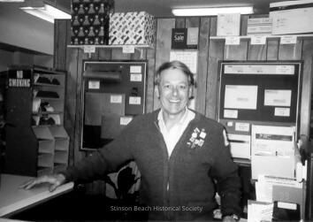 In this black and white photograph a man (Bill Grimes) stands smiling at the camera. He is wearing a cardigan sweater which has a cluster of pins (U.S. postage stamp pins?) pinned to the left shoulder of the sweater. He is in the post office and behind him are displays of different sizes and types of envelopes. There also are mailing boxes displayed on high shelves, two of which are Christmas wrapped. His hand is resting on a counter top to his right where there is a shelf with multiple cubby holes.Collection