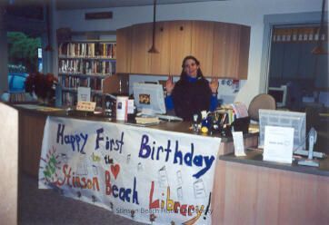 In this color photograph a woman (Kerry Livingston, librarian) stands behind a counter covered with library paraphernalia (pencils, pens, stamps, brochures, a computer). She has both hands raised to shoulder level with palms facing outward and is smiling at the camera. There is a large hand painted sign attached to the front of the counter reading 'Happy First Birthday to the Stinson Beach Library'.Collection
