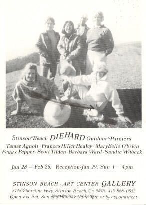 This is a postcard announcement of a show by the Stinson Beach DIEHARD Outdoor Painters at the Stinson Beach Art Center Gallery (Jan 28 - Feb 26, 1989). The 7 artists named are: Tamae Agnoli, Frances Hiller Healey, MaryBelle O'Brien, Peggy Pepper, Scott Tilden, Barbara Ward and Sandie Witbeck; however, only 6 are pictured. Who is missing?Collection
