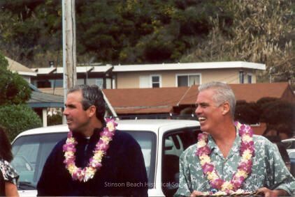 In this color photograph two men wearing leis are shown from the chest up. They are looking to the left. The man on the left is Kevin Lorne, nephew of the deceased, Bill Wilson. The man on the right is Kevin's brother Steve Lorne.Collection