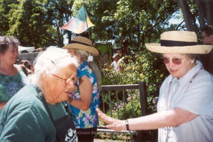 In this color photograph two women face each other in conversation. The woman on the left is Nancy Sullivan; the woman on the right is Janice Cline. Neither is looking at the camera. Rather they seem to be focusing on the ground between them. Nancy wears glasses, a green sweat shirt and a green apron with white writing and figures on it. Her hair is white and she wears it in braids on top of her head. Janice is wearing a brimmed straw hat and a short sleeved blouse and dark glasses. Her left arm is outstretched with the palm down. Behind them to the left are two other women conversing. The one on the left is Barrie Stebbings. There is shrubbery behind the women.Collection
