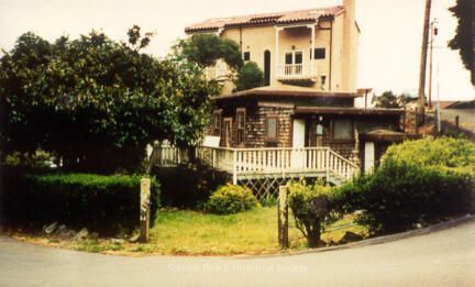 This color photograph shows a brown shingle house with a white railed porch (the Lambert House) in a grassy yard. There is a hedge enclosing the yard with a wide entry opening and a paved road curving around the outside. Rising behind the shingle house is a tall, pale ecru stucco house with tall windows. It is Casa Del Mar, a Bed and Breakfast inn at the time. There is a large tree in the yard of the lower house, on the left.Collection