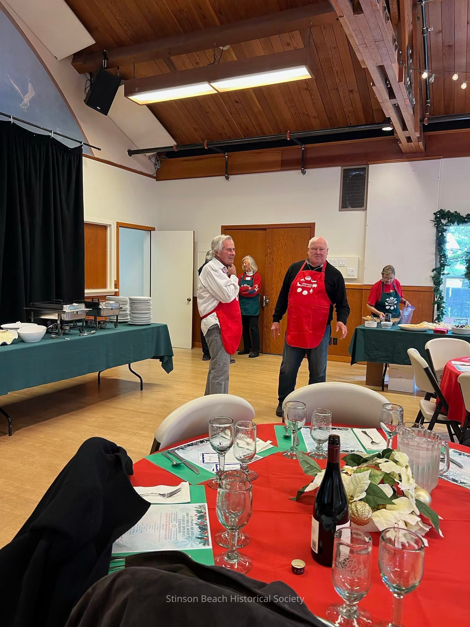 Kevin Hicks and David Hornig, elves who helped with serving and clean-up. Susie Nelson in the background on left with Barbara Wechsberg staffing the appetizer table.
