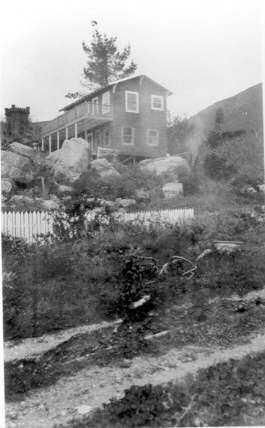 This black and white photograph is a two story house perched on boulders of bedrock up a steep hill. The house has a deck, supported by posts, which runs the length of the upper story. A white picket fence encloses the house in it's natural rock garden. There are shrubs and a dirt road in the foreground. The house is the old Secord house which later was sold and remodeled and became the Casa del Mar B&B.Collection