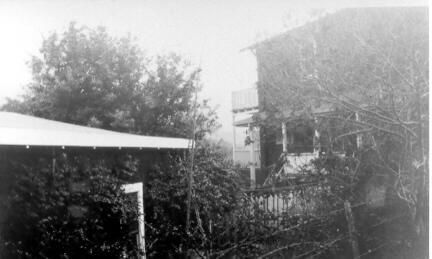 In this black and white photograph we see the back corner of the Lambert house (see 2001-175-01) and part of the Secord house (see 2001-174-01) behind it. There is a great deal of shrubbery and trees obscuring both houses and the quality of the photo is clouded and poor.Collection