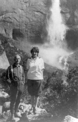 A black and white photograph of a couple standing in front of Nevada Falls, Merced River, in Yosemite. They are the parents of Tom Lambert who donated this photograph. His father, John is in sport shirt, pants with suspenders and hiking boots. She stands in the center of the photo wearing half-sleeve blouse and knee length knickers and hiking shoes. The Falls flows down on the right in background. They are the couple who originally built the Lambert house (cottage).Collection