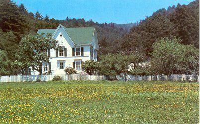 Early color postcard of "The Allma Brooks Walker House at Audubon Canyon Ranch, north of Stinson Beach, California. This century old farmhouse was named in honor of a generous benefactor of the ranch. There is a heronry in the redwoods behind it." The white 2-story house with a peaked roof at its center, sits behind a white picket fence, separating it from a grassy field with yellow flowers.Collection