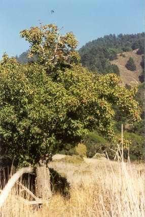 A fruit tree (looks like red apples on the branches) located on the old Stinson/Nye Ranch. It sits in a field of dry grass and the mountain, partially covered with green pine trees, rises up behind it.Collection