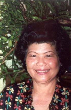 In this color photograph of Oy Airey she smiles at the camera. Her hair is black and she is wearing a colorful print blouse with red and tan bows on green ribbons on a black back ground. She is in front of some house plants.Collection
