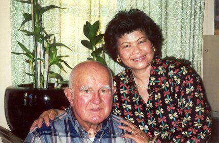 In this color photograph a man (Hal Airey) and a woman (Oy Airey, his wife) smile into the camera. He is a white haired, balding man wearing a blue plaid shirt. She is a dark haired Asian woman wearing a print blouse that has red and tan bows on a black background. There is a black bowl with a houseplant behind them and a green and white print curtain behind that. Hal is the son of Frank and Marge Airey, grandson of Harry and Elizabeth Airey, who started the Airey Hotel/Airey Store at the corner of Highway 1 and Calle del Mar in 1908 moving from San Francisco after 1906 erthquake. This series of photographs were taken by Sally Veauta on the occasion of her oral history visit to Hal.Collection
