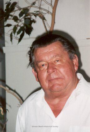 Color portrait photograph of Fred Conradi taken by Sally Veauta at the occasion of her taking oral history of him. He is in a white shirt. Behind him is an off-white wall and a branch of fichus house plant.Collection