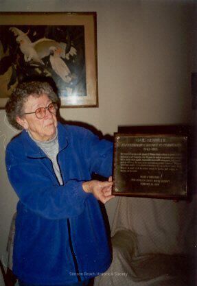 A color photograph of Manetta Bennett holding the plaque presented to her husband Gail Bennett for his distinguished service to Stinson Beach Water County Water District. Its title reads: Gail Bennett For Exemplary Service to Community, 1940-1985. The photograph was taken on the occasion of Sally Veauta taking oral history from Manetta. Manetta is standing in front of the wall of her family home on which a picture of parrots (possibly an Audubon painting) hanging. She is wearing eyeglasses, gray t-neck shirt and blue jacket. Her curly short hair is salt and pepper gray.Collection