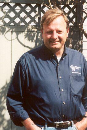 A color photographic portrait print of Jim Fischer taken at the time of Oral History taken by Sally Veauta. Jim is standing in front of a garden fence with diamond lattice work. He is wearing a dark blue shirt.Collection