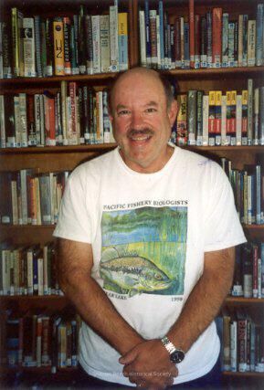 A portrait color photograph of Tom Lambert taken at the time of oral history interview. He is wearing a white t-shirt with a illustration of a fish in green-blue water with title, Pacific Fishery Biologists, Clear Lake 1998" and a dark blue pants (shorts) and standing in front of the old Stinson Beach Library book shelf. He has his hands clasped in front with his watch hand in front. His greyish hair is receding, he has a moustache, and he is smiling to the camera. Handwritten on the back of this photograph: Tom Lambert 9/1999.Collection