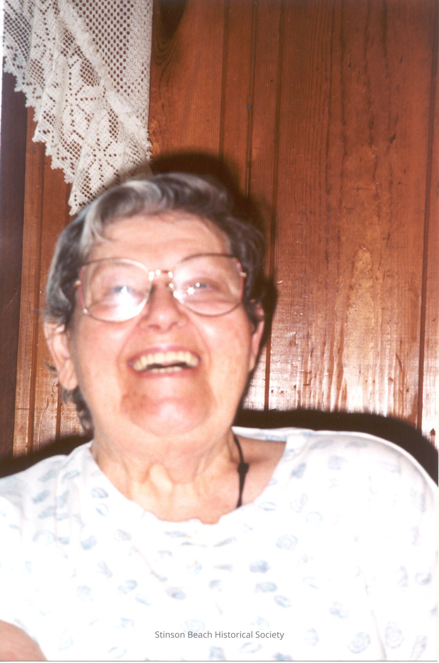A color portrait photograph of Gertrude Helfrich taken by Sally Veauta at the time of her oral history interview. Bespectacled lady with short gray hair is smiling at camera. She is probably sitting on a couch in front of a wooden wall of a room. There is a white lace edge hanging above her head probably belonging to a lamp. She is wearing a white shirt with blue-ish print.Collection