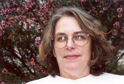 Color photograph of Mary Robinson's face taken by Sally Veauta at the time of her oral history interview. Bespectacled Mary is smiling toward the camera. Magenta geranium is in bloom in the back ground.Collection