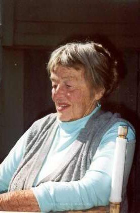 This color photograph is a three quarter view of Mary Jones. She wears a light blue turtleneck with a grey vest. Her hair is greyish brown and short.Collection