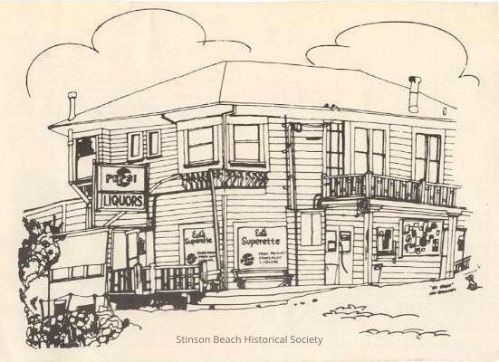 This is a pen and ink sketch of the Stinson Beach Market when it was Ed's Superette. The windows, the balcony, the railings, the payphone, bulletin board and signs are all rendered in detail. It was done by Ken Shockey, local artist, for one of the store calendars (year unknown).Collection