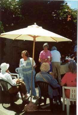 Sitting under a white sumbrella in front left to right: Veauta, Sally/Pepper, Peggy/Griffin, Marna/ back row facing : Moyce/ Shirley/ Slack, Jane/ Bewley, Virginia , back view.Collection