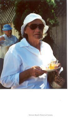 See 2001-228 and 234. A lady in white cloth hat , Mayers, Loretta, is holding a paper plate and a drinking cup with orange juice. She and her sister, Jones, Mary built the only duplex in Stinson on Calle del Sierra in 60's and lived there a while until married to Ken and moved away.Collection