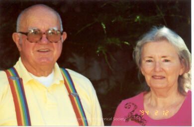 See 2001-288. A man, Airey, Hal, and a lady in magenta colored shirt, Griffin, Marna, is standing looking at the camera. They are the siblings of Frank and Merge Airey who owned the Airey Building where the town grocery store is, now.Collection