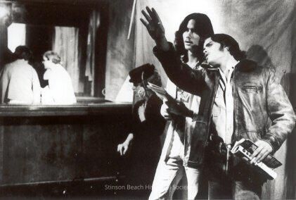Black and white photo of a scene from the play "Mysterious Doings in Rinso Bleach", subtitled or "Gossip's Gonna Getcha If You Don't Watch Out," by John Grissim. The photo shows inside entry counter of a bar with one man (building department inspector) gesturing toward the ceiling to the man beside him. A Japanese fish flag hangs on a pole to right behind the bar. One well dressed lady in hat (Hillary Raymond), two long-haired men (Bruce Roush with folded newspaper in his hands dressed in Hawaiian shirt, jeans and jacket; Greg Smith one hand raised as if to describe the distant view or object, other hand holding a thick magazine titled OOM) stand in foreground. Greg has his long hair in pony-tail, and wears jeans and shirt with a leather jacket on top. There are two people talking in other side of the counter and a large poster of a building is on the wall.Collection