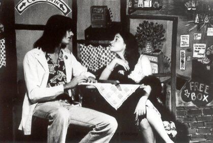 Black and white photo of a scene from the play "Mysterious Doings in Rinso Bleach", subtitled "Gossip's Gonna Getcha If You Don't Watch Out," by John Grissim. The scene shows long haired man (Bruce Rousch) in a white suit and Hawaiian shirt sitting at a table gazing at the woman across from him (Raven Shauf). She has her chin raised in the air giving him a look of satisfaction, with one arm propped under, but not touching, her chin. They are sitting outside the deli, which has a sign in the window saying "Come on in" and to the right of them is a storefront with notices posted in the window and a "Free Box" sign with an arrow pointing down.Collection