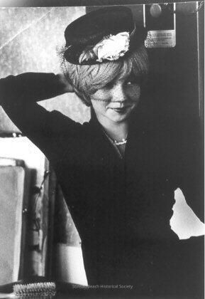 Black and white photo of a scene from the play "Mysterious Doings in Rinso Bleach", subtitled "Gossip's Gonna Getcha If You Don't Watch Out," by John Grissim. The scene shows woman (Hillary Raymond) in a black dress and hat with a half-veil holding her arm behind her head as if adjusting her hair, which is actually a pouffy blond wig. A round hair brush is laying on the table beside her.Collection