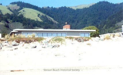 The flat rooftop, brick chimney and tops of the windows that run the length of the McCready house are visible above the sand dunes, rip-rap and dune grasses. The house is one the the earliest homes built on the sandspit in Seadrift, located at 13 Seadrift Road. The tree-laden hillside of Mt. Tam provides a scenic backdrop.Collection
