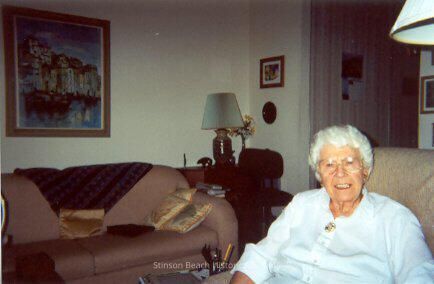 Adelaide McCready sits in her living room in Seadrift. She is dressed in pale blue. She has white hair and glasses. There is a large painting on the wall above the sofa off to the side of her. On the sofa are several pillows and a dark blue afghan. A table lamp and small vase of flowers is in the corner by the sofa. Also a smaller framed picture and a round object.Collection