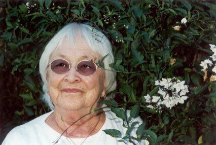 A color photograph of elderly woman in white hair and dark glasses standing in front of potato vine hedge. She is Helen Latham, this photograph was taken at the time of her Oral History interview by Sally Veauta who did the interview. She is wearing a white blouse and she was 83 years old at the time (2000). She owned a cottage on Calle del Embarcadero.Collection