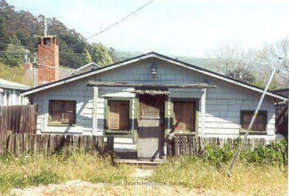 A color photo print of a house sitting close to the sandy ground. In the background you can see part of the Stinson Beach hills. The house has a gentle gable roof and its wooden shingle siding is painted light blue and the windows and the door at the center have darker blue trim boards. The house is fenced with grape stakes with widely spaced gate posts. On its lintel a sign on drift board, "The Mousehole", hangs. The symmetrically designed facade of the house has two windows on each side of the center door that opens to a small wooden porch.Collection