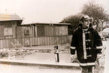 Fire Chief Kendrick Rand, in his SBVFD slicker and cap, stands on the bridge over Easkoot Creek where the water has risen to the floor of the house behind him (the old Elwoods?).Collection