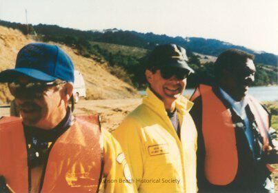 Kendrick Rand (L.) and Kevin Hicks (center) stand along the Lagoon on Highway One with Gary Booker, a Marin County Battalion Chief . They are gathered for a combined Fire Department training. Kendrick & Gary are wearing orange life vests, Kevin is in yellow vest. Kevin scheduled the joint gathering on a day the 49-ers were playing. Stinson was not happy; Bolinas was unaware but the drill went well.Collection