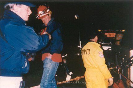 Nighttime Volunteer Fire Department training. There are 3 men in the photo but Kendrick Rand is the only person identifiable. He is in a blue windbreaker and cap. He is turned toward a fellow in a hard hat, windbreaker and jeans. The third person, dressed in a yellow jumpsuit with SBVFD on the back, has his back to the camera. "Southern Marin" is illuminated on the back of a barely visible fire truck.Collection