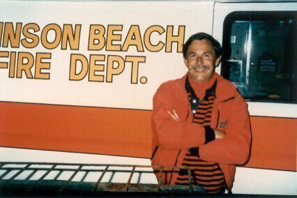 A color photograph of the Fire Chief, Kendrick Rand standing in front of the Stinson Beach Fire Dept. truck. " Stinson Beach Fire Dept" is painted in a bold gold color on the white body of the truck and a wide red stripe is painted underneath. Kendrick Rand, then the fire chief, is wearing a red jacket over a red and dark blue striped shirt, his arms folded in front of him. He was the fire chief from 1975 to 2001.Collection