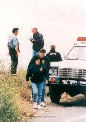 On the highway along the cliff, which is covered with dry grasses, a white fire jeep is parked though only the front end is visible. Standing at the cliff edge are Bobby Stevens and Kendrick Rand who is holding a walkie talkie. Walking around the jeep is Tommye Jarvis, followed by Kenny Stevens. A fifth volunteer fireman is standing beside the jeep but is only visible from the back. He is wearing an SBVFD sweatshirt.Collection
