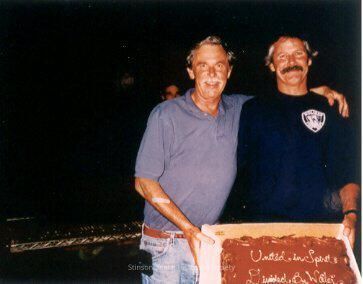 A color photograph of 2 local fire chiefs celebrating their joint exercise. Two men, Kendrick Rand, Stinson Beach Fire Chief, with his left arm resting around the shoulder of Kevin Hicks, Bolinas Fire Chief, are showing off a box holding a red-frosted cake with a white inscription: United in Spirits, Divided by Water. The black background shows it was celebrated in night.