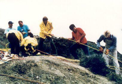 A color photographic print of SBFD Cliff Rescue Drill. Seven firemen are pulling on the rope attached to a rescue litter carrying an injured victim (a dummy) through the brushy hillside along the Highway One. Five men facing are: John McHugh, Dave Horning, Pat Norton, Bob Stevens and Guy Grover.Collection