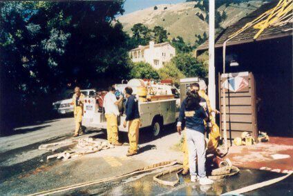 A color photographic print of 6 firemen at around the firehouse. The firehouse at the right of the photo has its door open. The ground in front of it is wet and fire hoses and other equipment are lying around. A fire truck is parked at the side of the firehouse, on the side street of the firehouse and another one is parked across the street. In the center mid ground of the photo, Rick Kline's Casa Del Mar bed and breakfast (now the private house) is shown. A group of trees shade the street. Summer yellow hill is seen behind all. The 6 firemen are cleaning and putting things in order after the fire drill. To the very left is Bob Boyce, third from the left is John Washington, Tommye Javis' back view is shown.Collection